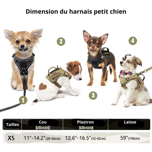 Nos harnais pour chien sont conçus pour s’adapter à toutes les races et tailles de chiens, offrant une solution parfaite pour le chien qui a des besoins particuliers. Qu’il s’agisse de petits chiens comme un bouledogue, un teckel, ou un chiot, ou de grands chiens comme un husky, un labrador ou un retriever, nos modèles de harnais réglables peuvent être ajustés pour offrir à votre chien un ajustement confortable et sécurisé. L’anneau situé à l’arrière permet de fixer une laisse pour chien avec un mousqueton solide, et les sangles ajustables offrent un maintien optimal, sans frottement ni gêne. Nos harnais de dressage sont particulièrement appréciés pour leur capacité à aider les chiens à s'habituer à marcher correctement en laisse, réduisant ainsi les risques de fugue et les comportements de tirage excessifs.